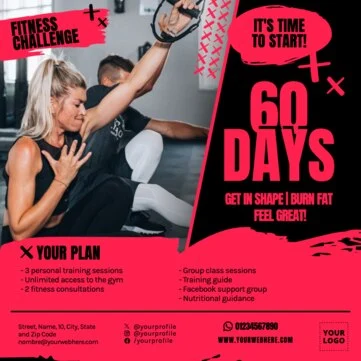 The platform is easy and intuitive to use. It is as simple as choosing the template design that you like best, and with a simple click, change the texts, colors, size of the elements, and typography. Don't forget to add the logo or name of your gym. You can also adjust the color range according to your corporate colors or using PRO template packs following the same style.