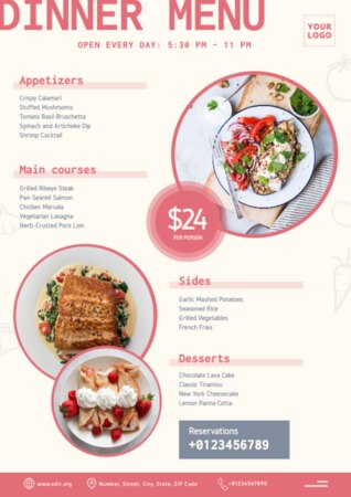 - Menus: there's no better way to inform your customers than by showing them a menu with an attractive design! In the editor, you will find many templates that will serve as a bedrock for just having to upload images of your dishes. If there's a change in any of your meals, just change the picture while keeping the same format. Then, download the result in the most suitable size for you or share it online.