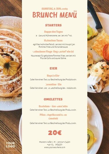 Entdecke die besten Vorlagen für Frühstücks- und Brunch-Menüs auf Edit.org, um diese Option in deinem Restaurant zu bewerben. Sie können alle mit wenigen Klicks und ohne Erfahrung im Grafikdesign angepasst werden.