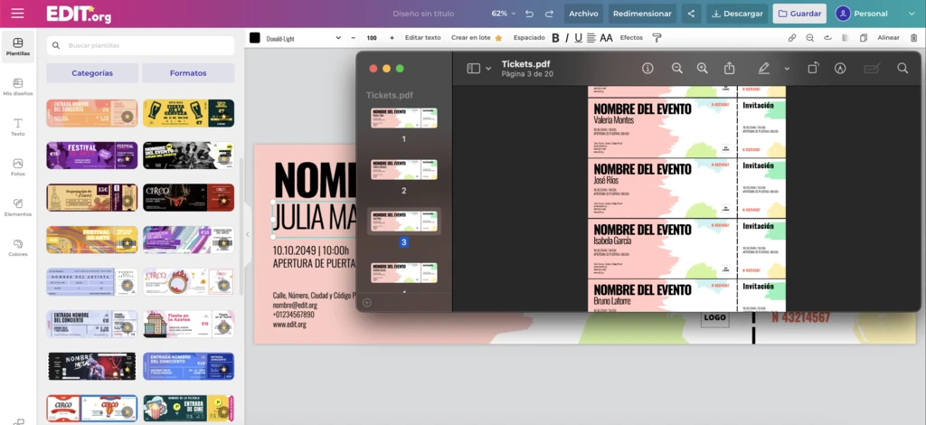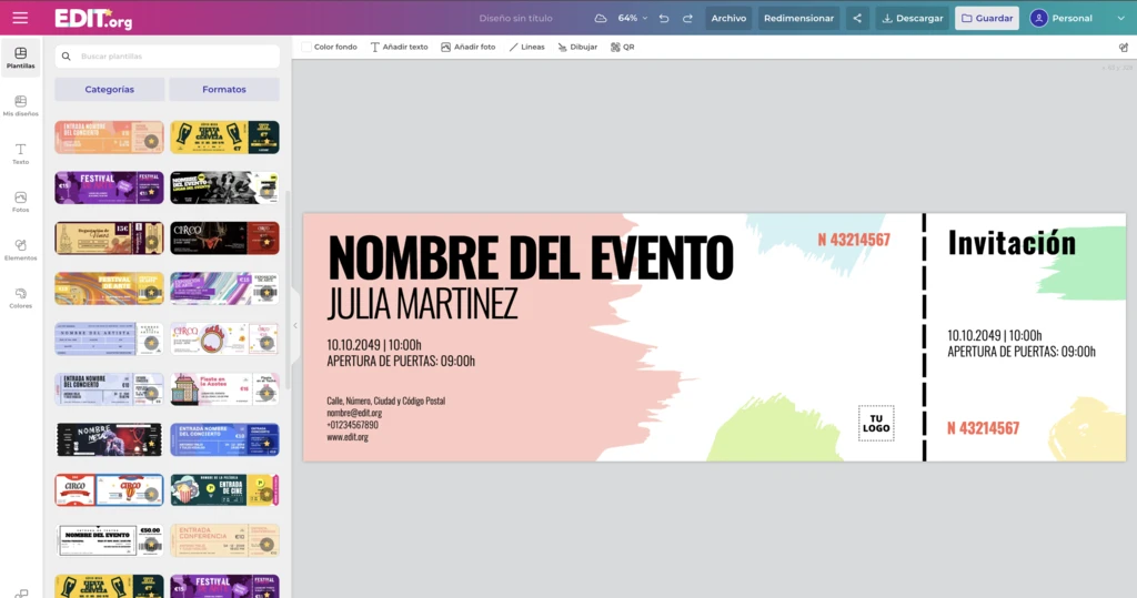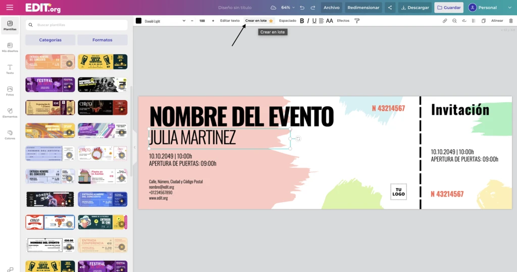 Crea un diseño en el editor que te sirva de base para tus diseños en lote. Como ejemplo, vamos a seleccionar una entrada para un evento.