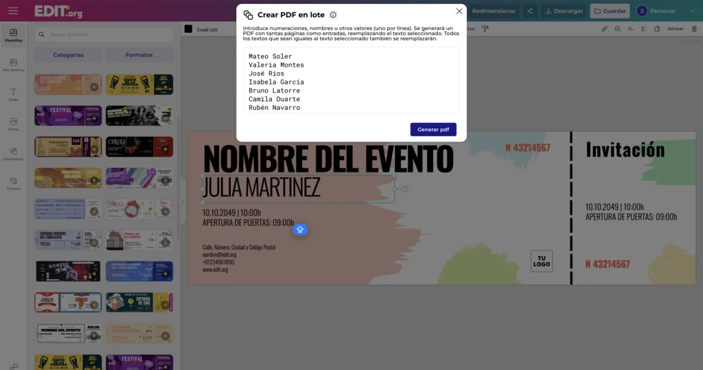 Copia y pega la información que quieras introducir en tus diseños (lista de nombres, datos, números, etc.) y haz clic en Generar PDF. En nuestro caso, vamos a probar de cambiar el nombre.