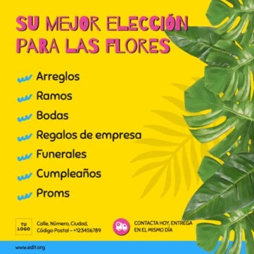 Diseña también un banner o cartel de florería anunciando tu nueva apertura. Crea un cartel de horarios o precios, así como diseños con consejos prácticos en relación al cuidado de las flores. No olvides celebrar fechas especiales como el Día de la Madre, Día del Padre o San Valentín.