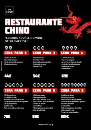 ¡Preparar un menú chino nunca ha sido tan divertido y fácil! Puedes cambiar las fuentes, los fondos y los colores de nuestras cartas de restaurante y flyers de comida china.