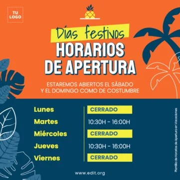 Lo ideal es colgar un cartel en la puerta de entrada del establecimiento, así como compartirlo en redes sociales para que tus seguidores también estén al día. Para cualquier formato que necesites, en Edit.org te traemos decenas de plantillas para editar y personalizar online para anunciar el horario de tu establecimiento, así como carteles de abierto y cerrado que podrás imprimir y colocar en la entrada.