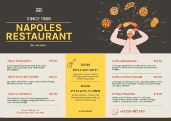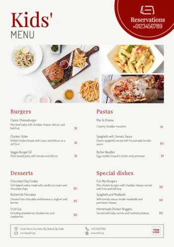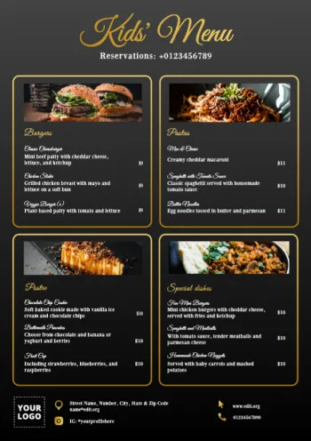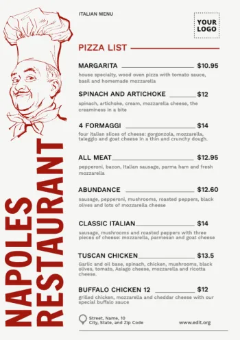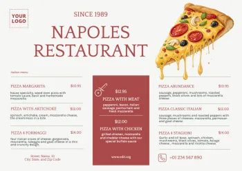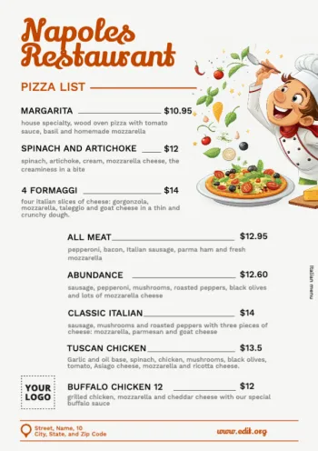 - Crea diseños de menús específicos: finalmente, te recomendamos que diseñes cartas de restaurante específicas para cada ocasión, tipo de comida o tipo de cliente. Por ejemplo, cartas de bebidas, de postres, para menú infantil, para Navidad y Año nuevo, para celebraciones de cumpleaños o para pizzas, entre otros.