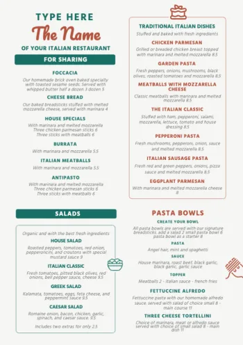 - Tipografía: es importante que utilices una tipografía legible y acorde con el tipo de restaurante que tengas. Tampoco abuses del uso de diferentes tipografías para la carta; con dos es suficiente: una para resaltar los títulos y la segunda para exponer los platos y precios.