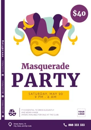 Avec Edit.org, vous pouvez organiser un Bal Masqué et obtenir une grande participation. Grâce à nos modèles modifiables, vous pouvez personnaliser :