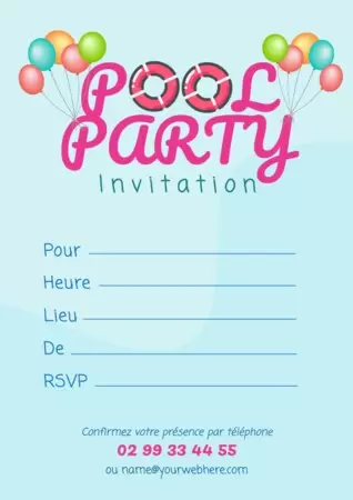 C'est une excellente idée d'organiser une fête de piscine pour un anniversaire, alors profitez-en avant que le beau temps ne soit passé ! Ajoutez sur vos cartes d'invitation tout le matériel que vos invités doivent apporter, ainsi que vos coordonnées, le jour, l'heure et le lieu.