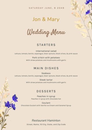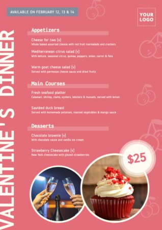 - Menu bevande o menu dessert: sono simili al menu, ma informano i tuoi clienti su una specifica gamma di prodotti che possono degustare nel tuo locale, dal vino ai dolci. Se desideri creare un'immagine migliore e di maggiore impatto, usa lo stesso stile di design in tutti i grafici, menu e altre risorse grafiche. Su Edit.org abbiamo pacchetti speciali a questo scopo.