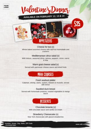 - Menu: non c'è modo migliore per informare i tuoi clienti che mostrare loro un menu dal design accattivante! Nell'editor troverai molti modelli che serviranno da base per caricare semplicemente le immagini dei tuoi piatti. Se c'è un cambiamento in una qualsiasi delle tue portate, cambia semplicemente l'immagine mantenendo lo stesso formato. Poi, scarica il risultato nella dimensione più adatta a te o condividilo online.